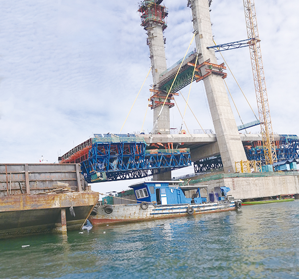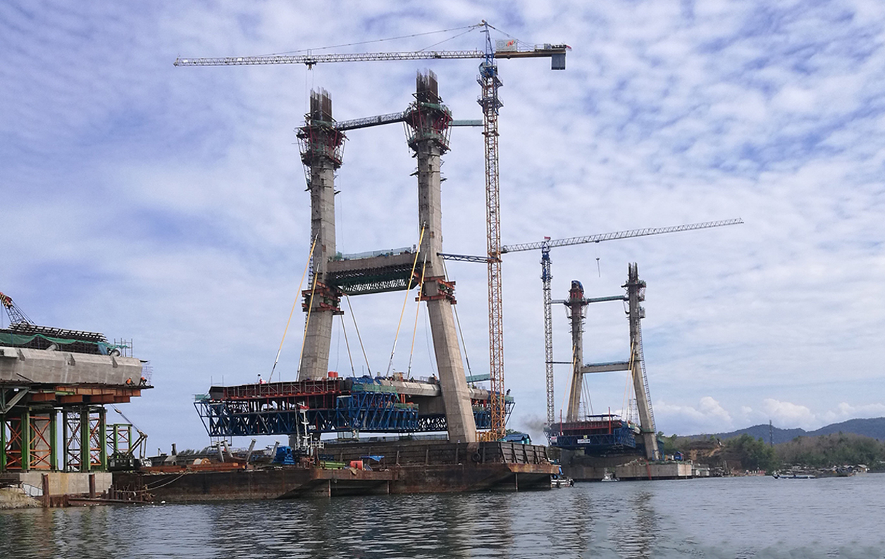 肯達(dá)里斜拉橋位于印尼蘇拉威西省,橋梁全長474.08m,主跨388m,雙塔高約78.35m,預(yù)應(yīng)力混凝土橋面寬25m,采用雙向雙車道公路和兩條人行道。